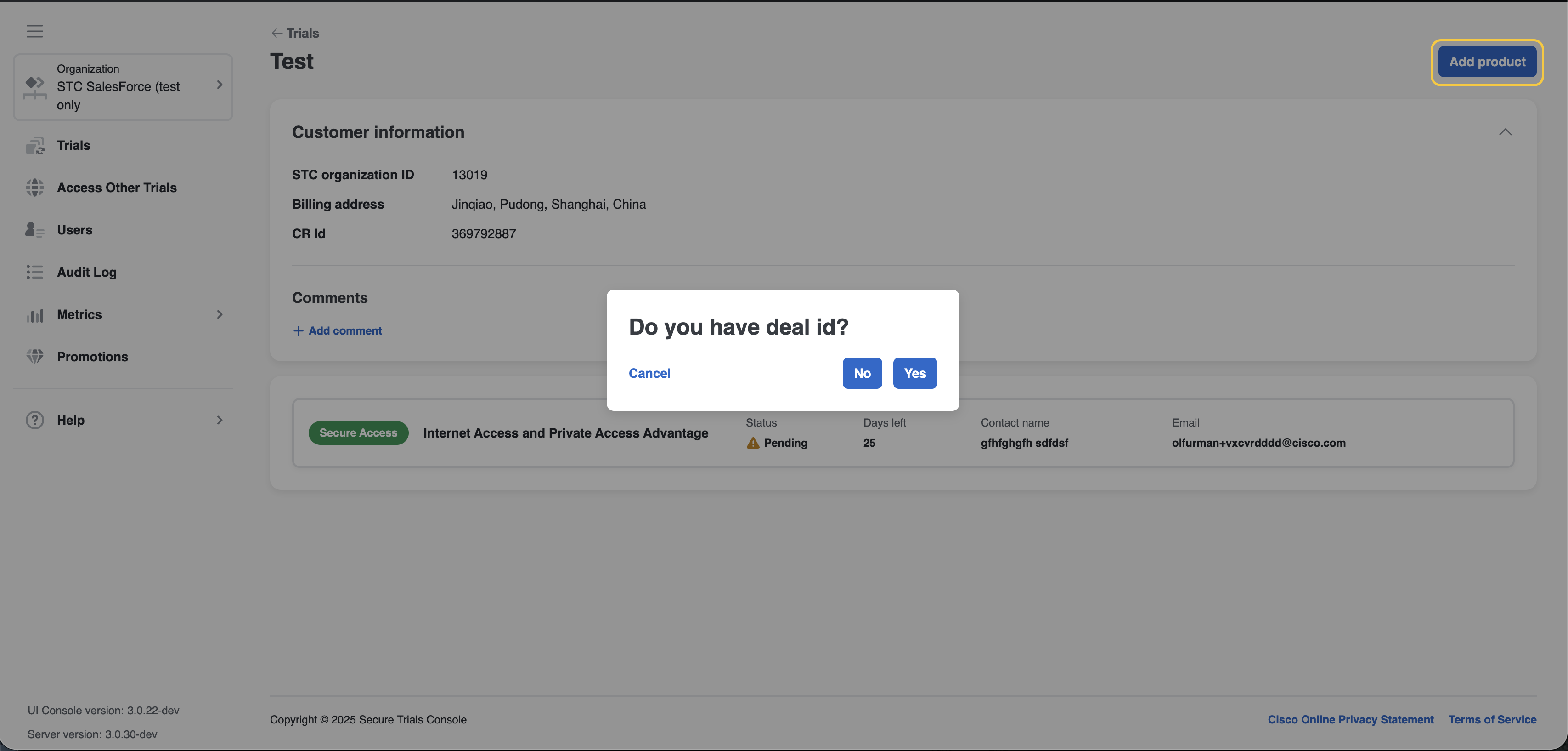 Add a product to an existing customer record. You can add a new product either with or without a Deal ID. If you specify a Deal ID when adding a product, the customer information will be automatically populated during the second step of trial creation. If the Deal ID does not match the customer record you are working with, you will be notified and given the option to either continue without the Deal ID or insist on proceeding with the specified Deal ID.