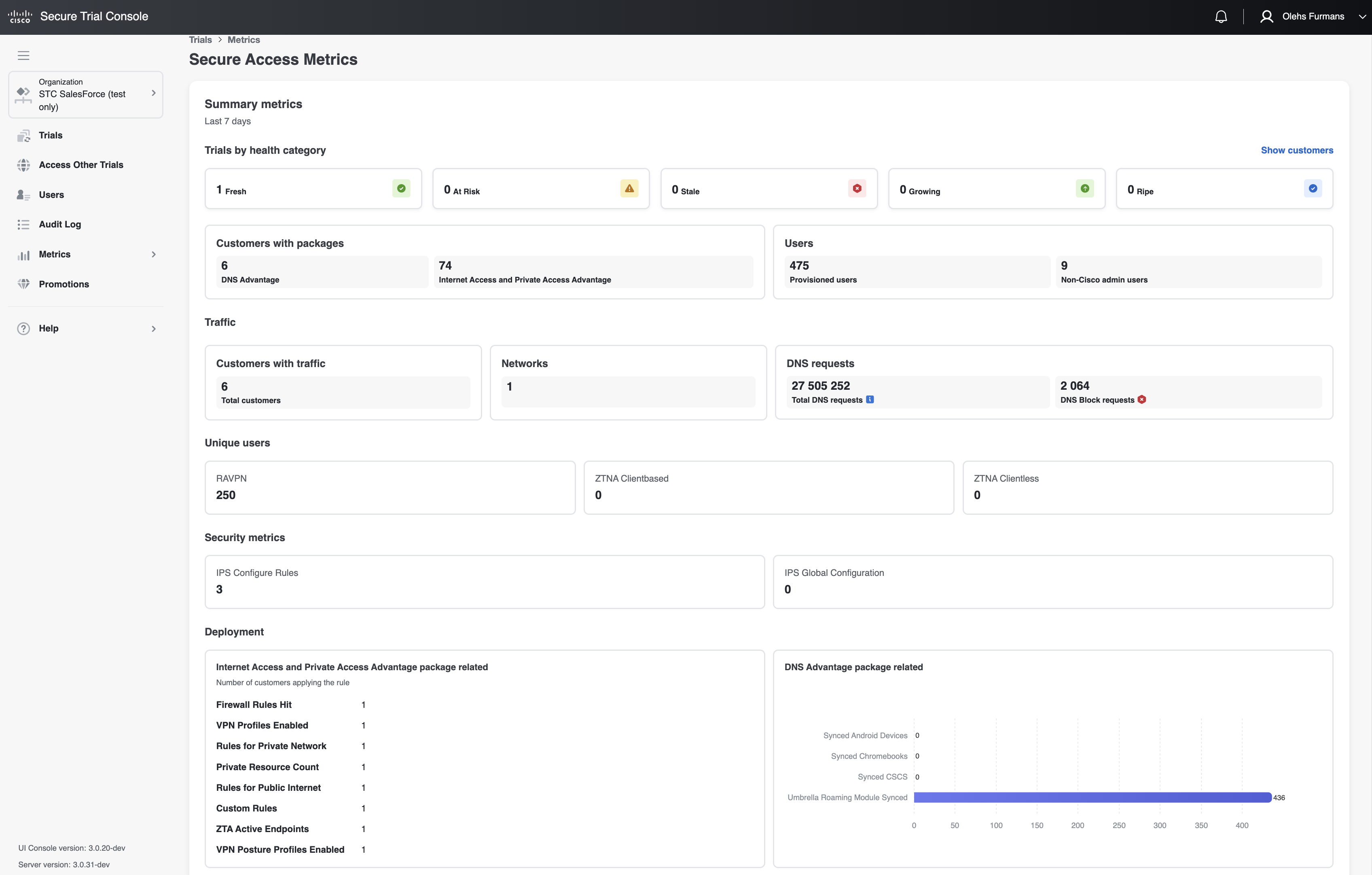 Secure Access Metrics offers an overview of key performance indicators and configurations for customer accounts. It provides detailed insights into trial health, user activity, security settings, and additional package related metrics enabling you to monitor adoption and enhance system performance.