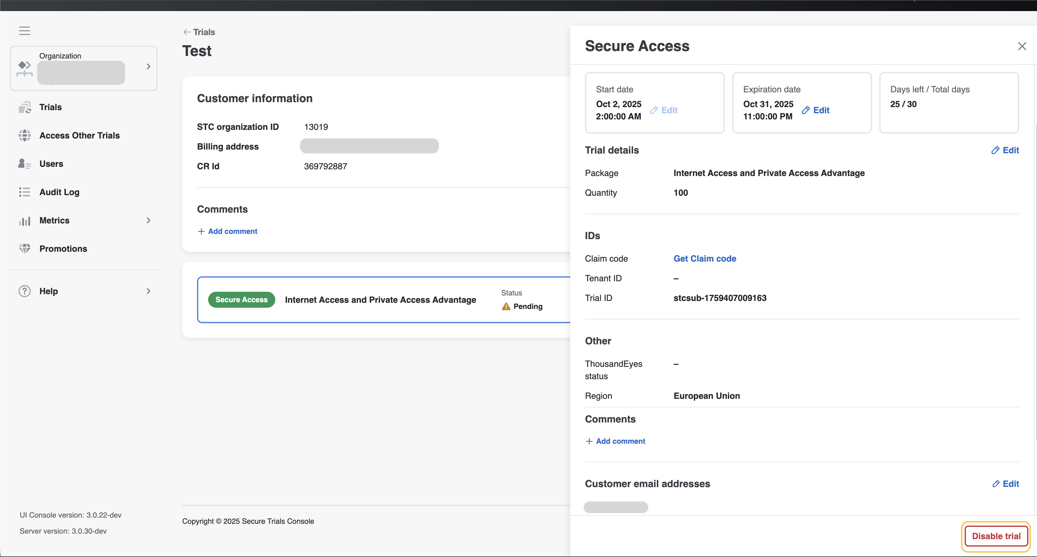 You can disable an active or expired trial at any time. When you do so, the trial's status changes to Disabled in the console. This change affects only the status in the console and does not impact the customer's trial experience.