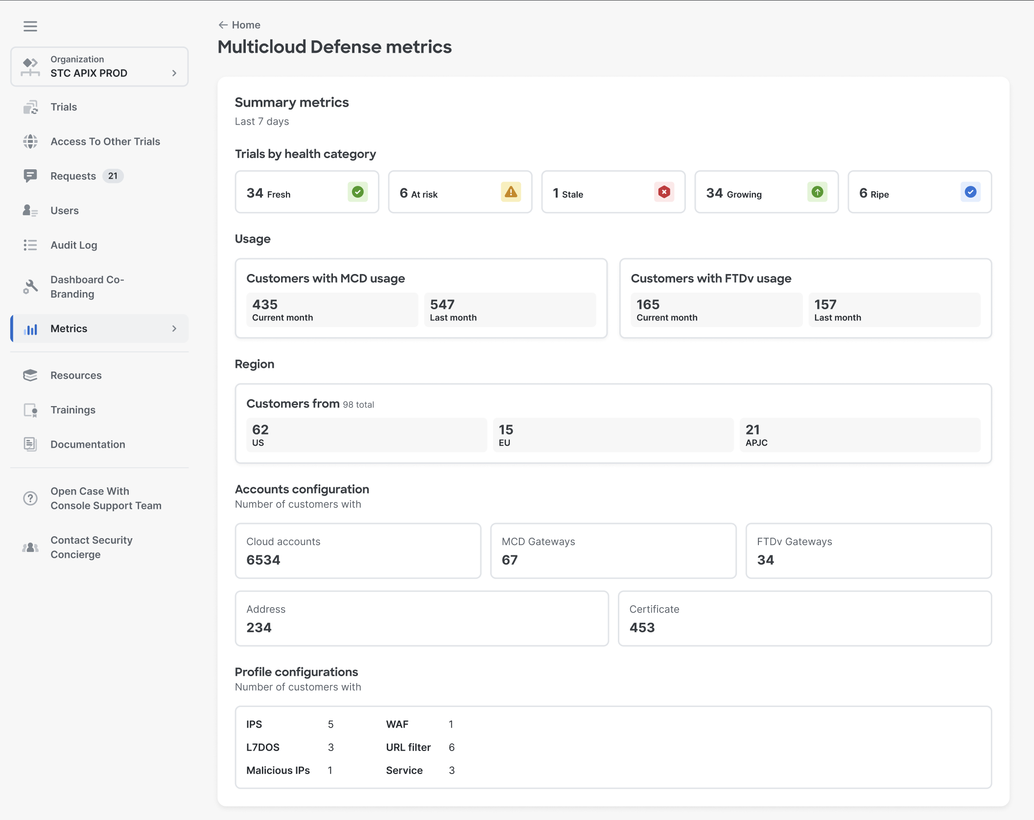 Multicloud Defense Metrics offers an overview of key performance indicators and configurations for customer accounts. It provides detailed insights into trial health, usage, spliting by region, account and profile configurations, see image below.