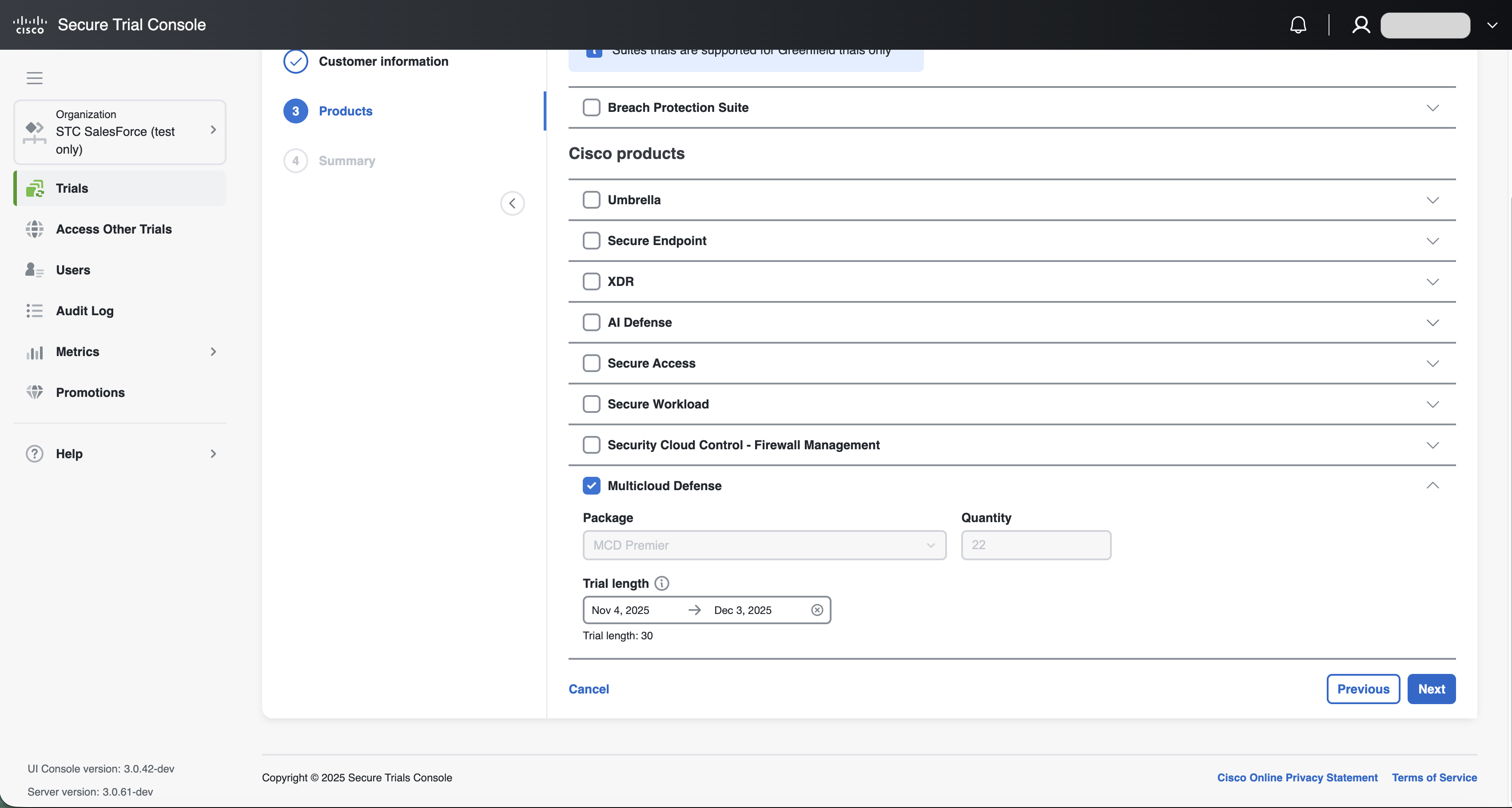 First and second steps of Multicloud Defence trial creation are described in Start a New Trial.