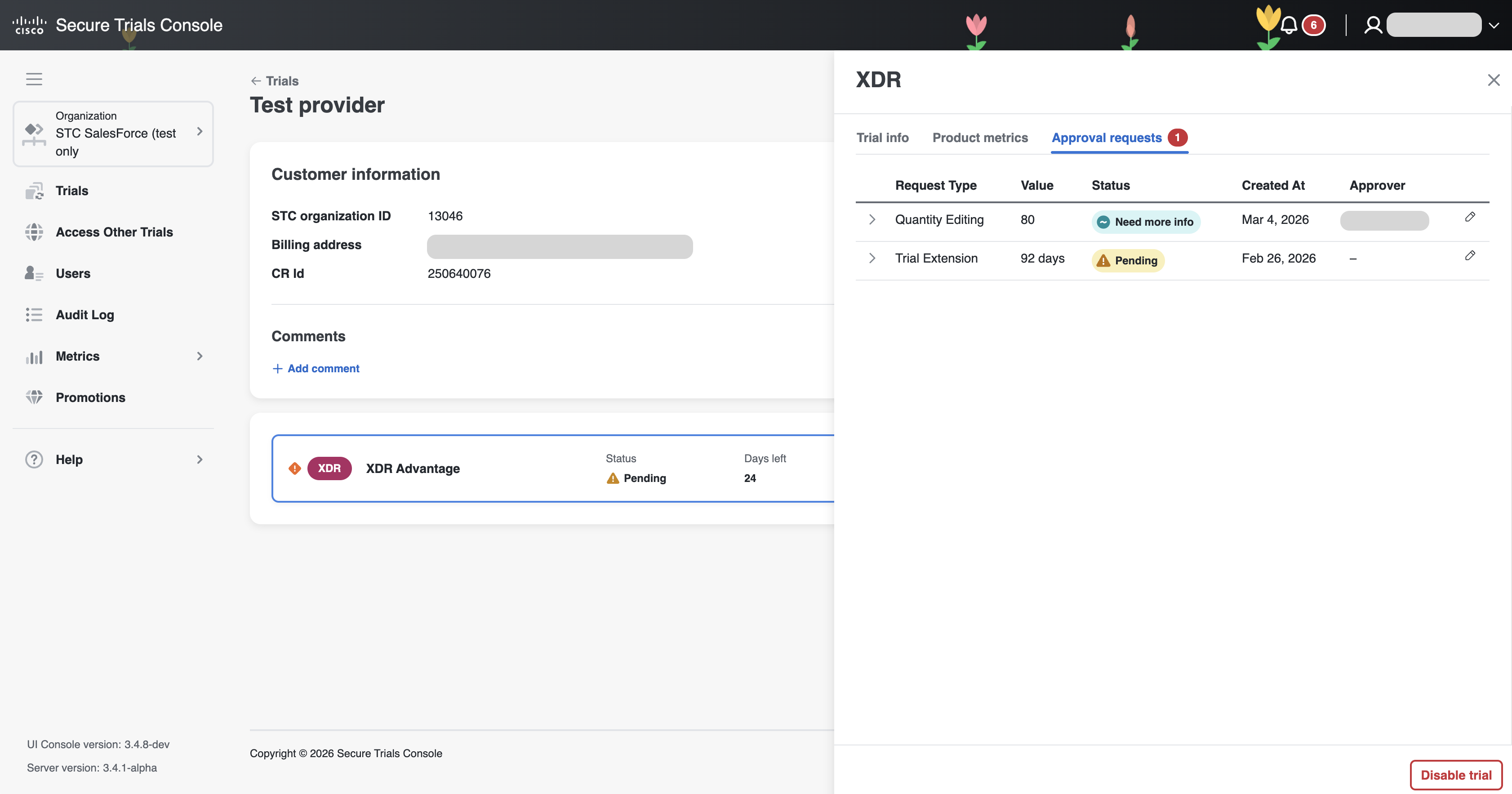 To monitor the status of trial-related approval requests and make changes when necessary, the seller can use the Approval Requests tab. This tab is located on the trial info page (see image below).