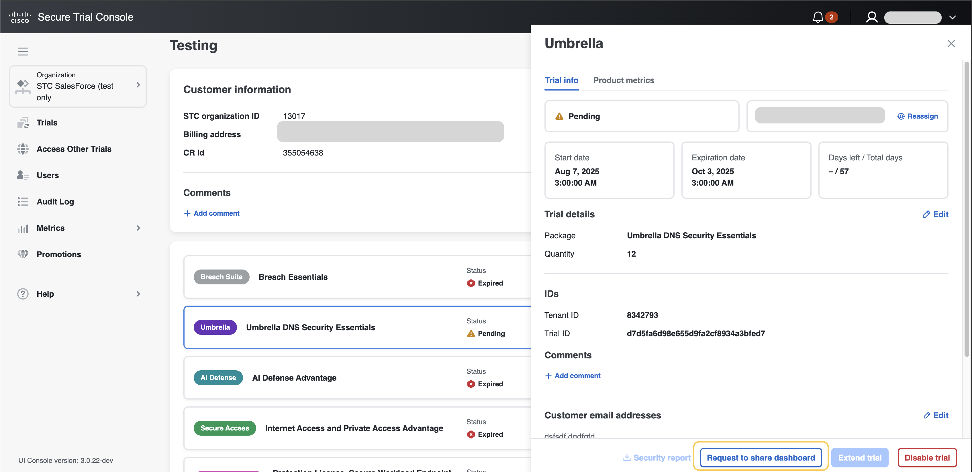 Step 3 | On the trial’s page, in the Umbrella section, select Request to share dashboard.